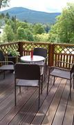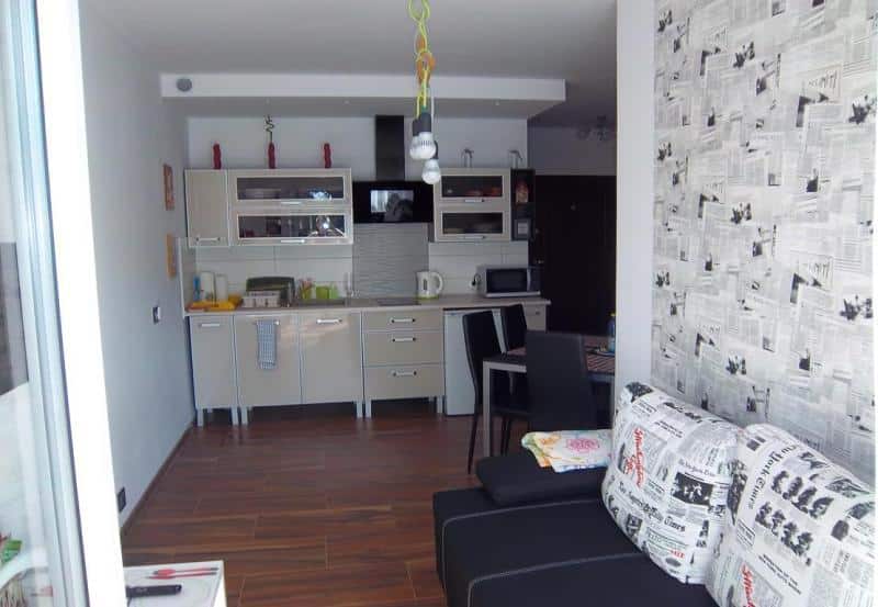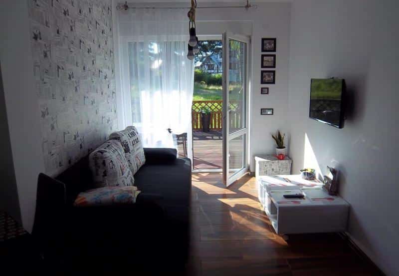 Apartament jest przestronny i komfortowy, składa się z dwóch pokoi, co czyni go idealnym dla czterech osób. W części dziennej połączonej z aneksem kuchennym można spędzać wspólnie czas, a sypialnia oferuje spokojny wypoczynek. W obu pomieszczeniach znajdują się rozkładane sofy i telewizor, co zapewnia dodatkowy komfort. Aneks kuchenny jest w pełni wyposażony, co pozwala na samodzielne przygotowywanie posiłków. Dodatkowym atutem jest duży taras z widokiem na góry, idealny na poranną kawę czy wieczorny relaks.
