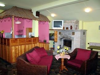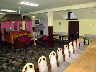 – Sala kominkowa z barem, TV i stołami biesiadnymi