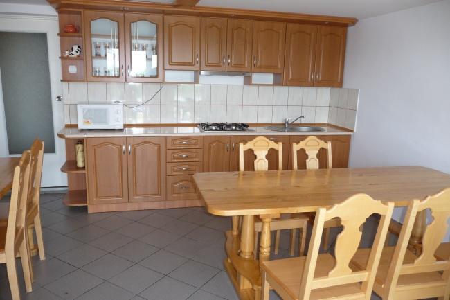 – Parter: pokój 3-osobowy (1×80, 1×140), łazienka (prysznic, umywalka, WC), kuchnia z jadalnią (aneks kuchenny, lodówka, TV)