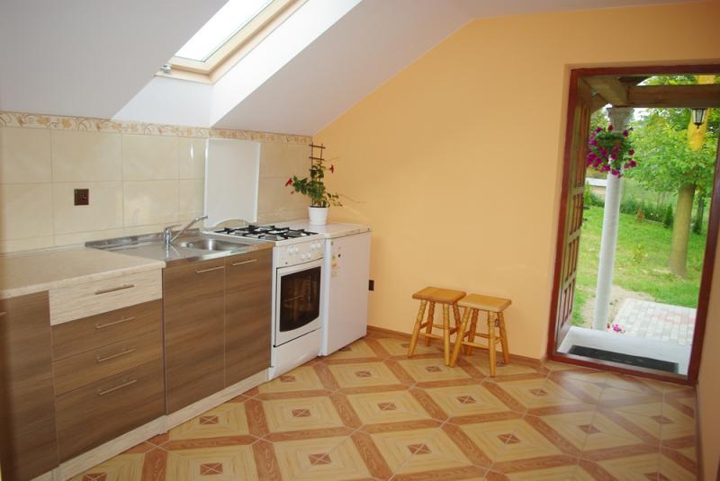 – Drugi domek: dwa pokoje, w pełni wyposażona kuchnia, łazienka z podobnymi udogodnieniami.