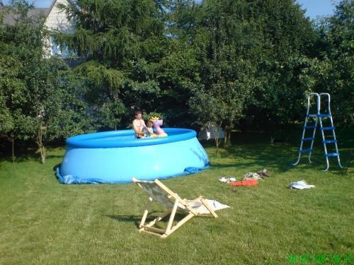 – basen ogrodowy, trampolinę, zjeżdżalnię, huśtawki i piaskownicę,