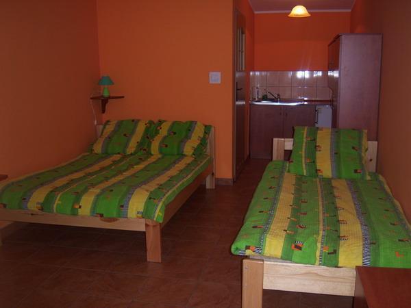 Zapraszamy do naszego urokliwego obiektu, idealnego na relaks i wypoczynek! Oferujemy różnorodne pokoje: dwuosobowe, trzyosobowe i czteroosobowe, każdy z prywatną łazienką i aneksem kuchennym. Nasz parterowy budynek zapewnia wygodny dostęp do każdego pokoju, który posiada osobne wejście z zadaszonego tarasu. Na tarasie znajdziesz komfortową ławeczkę z małym stolikiem, idealne miejsce do odpoczynku na świeżym powietrzu.