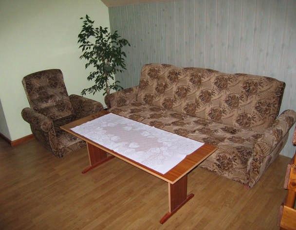 W przestronnym holu, który łączy pokoje z kuchnią, znajduje się wygodny zestaw wypoczynkowy z kanapą, fotelami i stolikiem. To idealne miejsce do relaksu po dniu pełnym wrażeń.