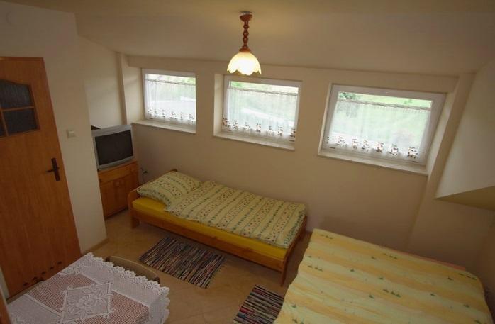 – 2 pokoje 3-osobowe (1 łoże małżeńskie, tapczanik 1-osobowy, stół, szafa, telewizor, własna łazienka z prysznicem)