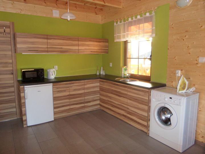 – Otwartą kuchnię z jadalnią, wyposażoną w kuchenkę elektryczną, mikrofalówkę, lodówkę, czajnik elektryczny, pralkę, żelazko, deskę do prasowania oraz pełen zestaw naczyń.