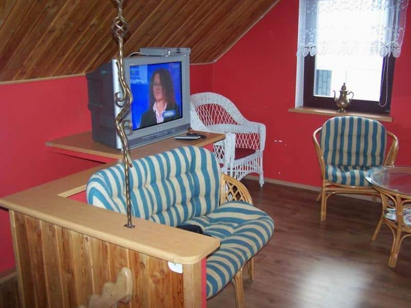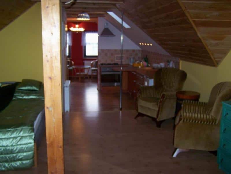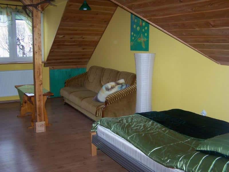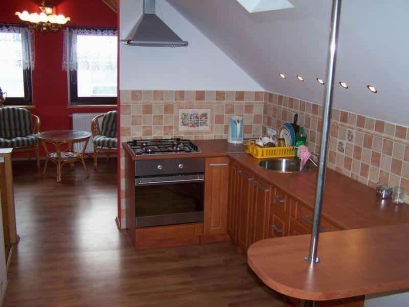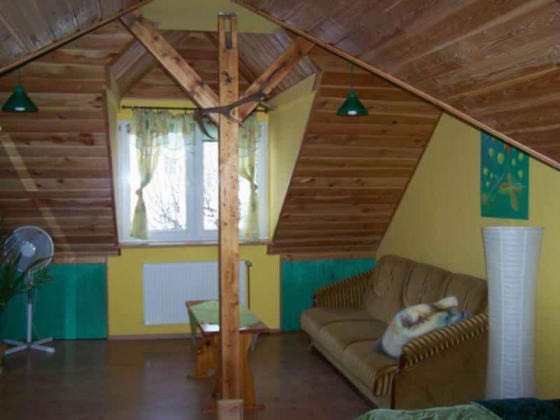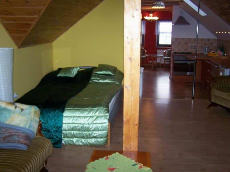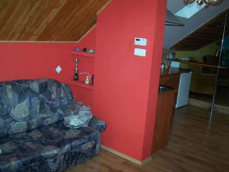 Wnętrze apartamentu zachwyca niebanalnym wystrojem, łączącym drewno z regipsem, co w połączeniu z uroczymi skosami tworzy niepowtarzalny klimat. Składa się z dwóch pokoi, aneksu kuchennego oraz łazienki. Pokoje i aneks kuchenny tworzą otwartą przestrzeń, co dodaje wnętrzu przestronności. Aneks kuchenny jest w pełni wyposażony – znajdziecie tu meble, lodówkę, kuchenkę gazową, czajnik bezprzewodowy oraz podstawowe naczynia kuchenne. Dodatkowo, w apartamencie znajduje się telewizor z dekoderem satelitarnym, żelazko, komplet pościeli i ręczniki.