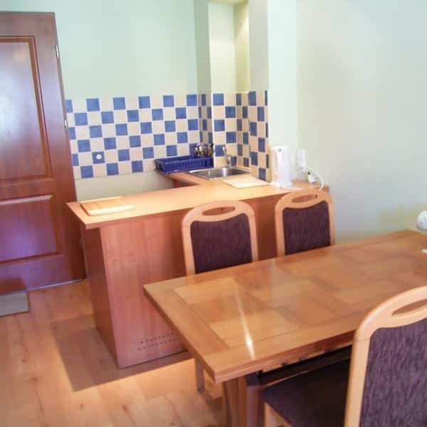 – Aneks kuchenny wyposażony w kuchenkę, lodówkę, czajnik elektryczny i komplet naczyń,