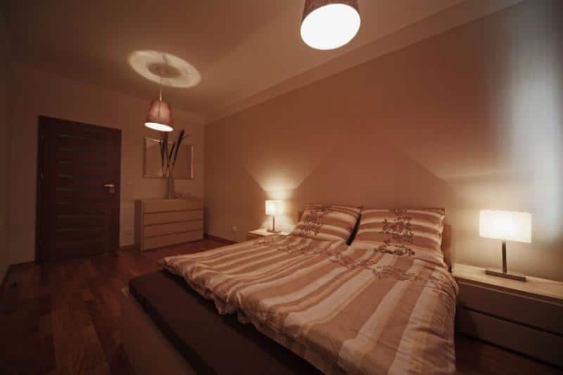 – Sypialnię z dużym, dwuosobowym łóżkiem, stolikami nocnymi i obszerną komodą z lustrem.