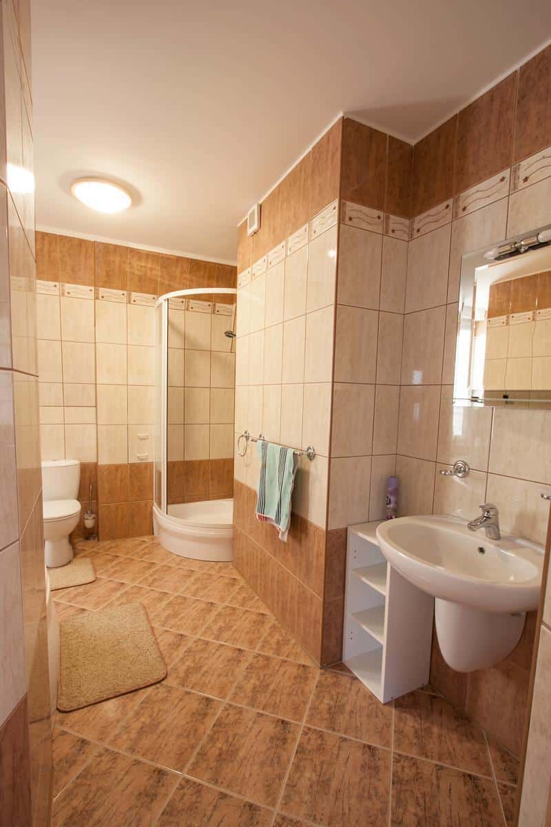 – łazienkę z wanną, prysznicem, pralką i suszarką do włosów,
