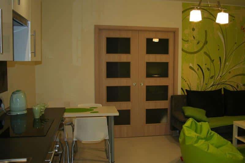 W aneksie kuchennym znajduje się wszystko, czego potrzebujecie – lodówka, płyta ceramiczna, zestaw garnków, talerze, kubki, szklanki oraz czajnik elektryczny. Łazienka utrzymana jest w wysokim standardzie i posiada przestronną kabinę prysznicową, WC oraz umywalkę. Sypialnia wyposażona jest w podwójne łóżko małżeńskie oraz przestronną szafę. W salonie znajduje się rozkładana sofa oraz telewizor LED satelitarny.