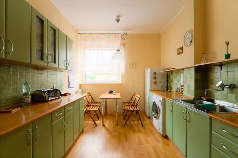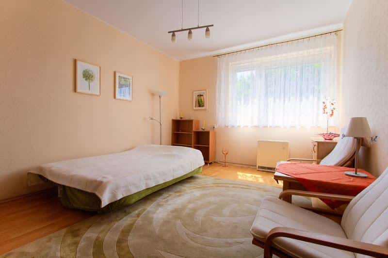 Apartament składa się z dwóch niezależnych sypialni, kuchni z jadalnią oraz łazienki. Jest w pełni wyposażony, w tym posiada telewizję kablową, internet, telewizor, lodówkę, kuchenkę gazową, czajnik elektryczny, zestaw naczyń, pralkę, żelazko, pościel oraz ręczniki.