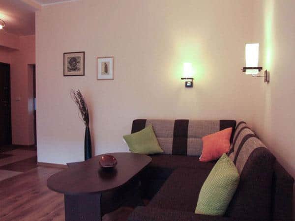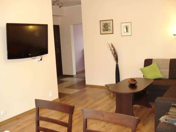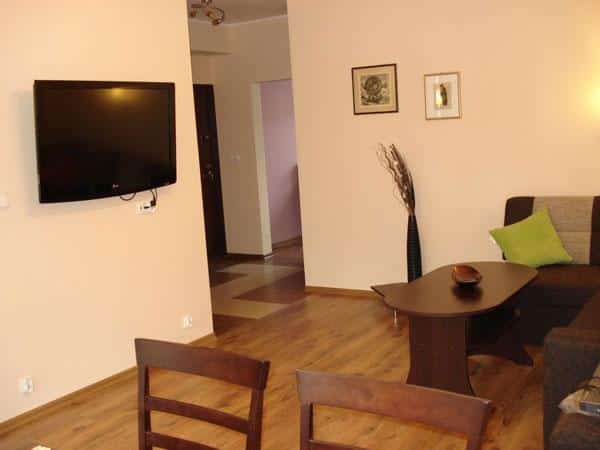 Nasz apartament o powierzchni 50 m² oferuje przestronny salon połączony z kuchnią, sypialnię, dużą łazienkę oraz przedpokój. W salonie czeka na Państwa duża, rozkładana narożna kanapa, stół z krzesłami, stolik okolicznościowy oraz telewizor 42-calowy. Z salonu można wyjść na balkon, gdzie znajdują się fotele ogrodowe i suszarka na bieliznę.