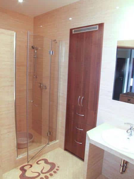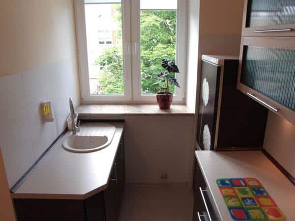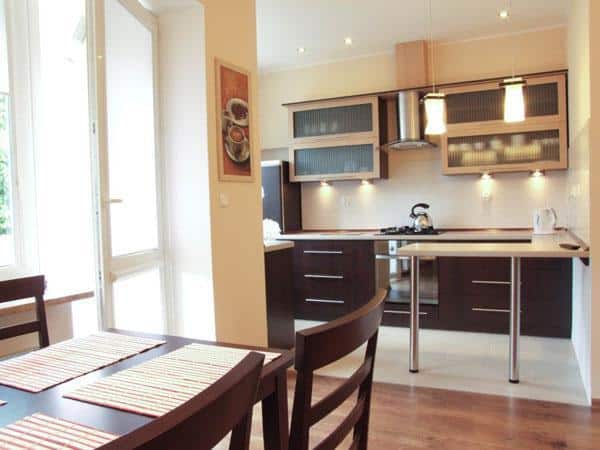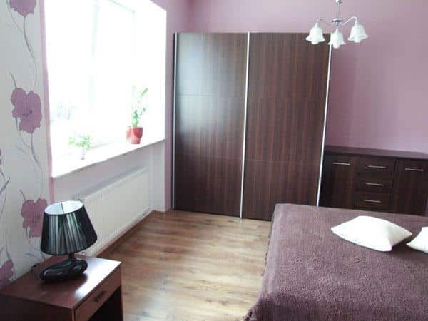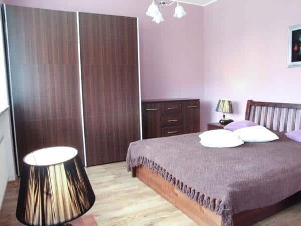 Sypialnia wyposażona jest w duże łóżko o szerokości 160 cm, pojemną szafę, biurko-toaletkę, komodę oraz szafki nocne. W przedpokoju znajduje się obszerna szafa typu “komandor”. Łazienka oferuje dużą kabinę prysznicową, pralkę automatyczną, umywalkę i WC. W pełni wyposażona kuchnia zawiera lodówkę, kuchenkę gazową, piekarnik, czajnik elektryczny i pełną zastawę stołową. Dodatkowo do dyspozycji pozostaje żelazko oraz deska do prasowania.