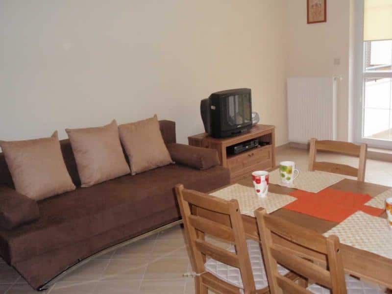 – Salon z aneksem kuchennym, wyposażony w stół z czterema krzesłami, dwie rozkładane sofy, ratanowe fotele, szafkę RTV z telewizorem, DVD i radiem oraz lampę stojącą.