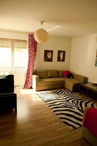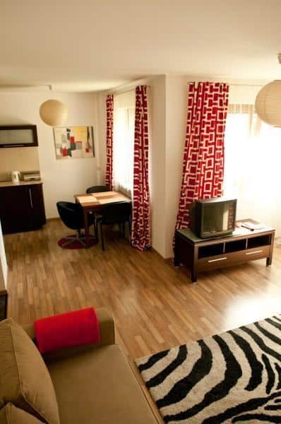 – Część wypoczynkowa z dwiema kanapami, stolikiem i telewizorem, gdzie można zrelaksować się po dniu pełnym wrażeń.