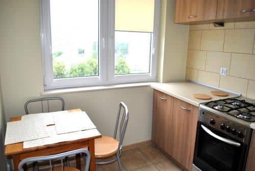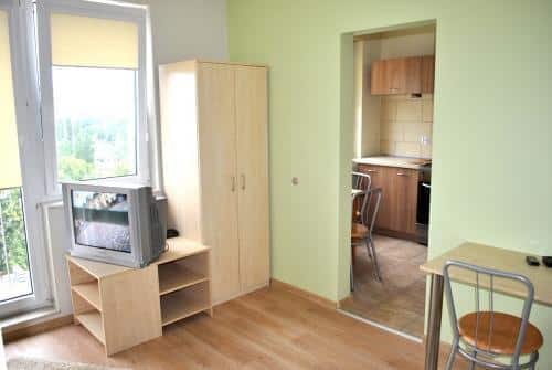 Wnętrze mieszkania jest funkcjonalnie zorganizowane. Znajdziesz tu przestronny pokój z wydzieloną strefą dzienną i sypialną, co pozwala na relaks i odpoczynek. Kuchnia z oknem jest w pełni wyposażona, umożliwiając przygotowanie posiłków w domowym zaciszu. Łazienka jest nowoczesna i zadbana, co gwarantuje komfort użytkowania.