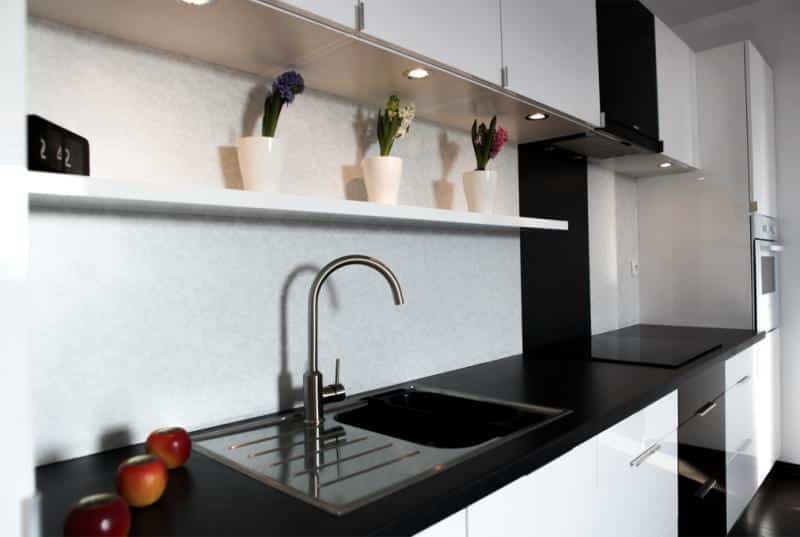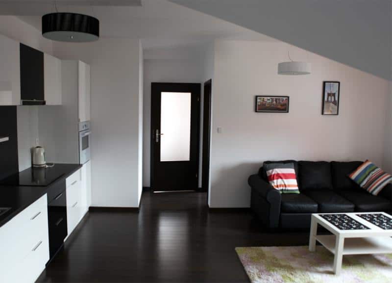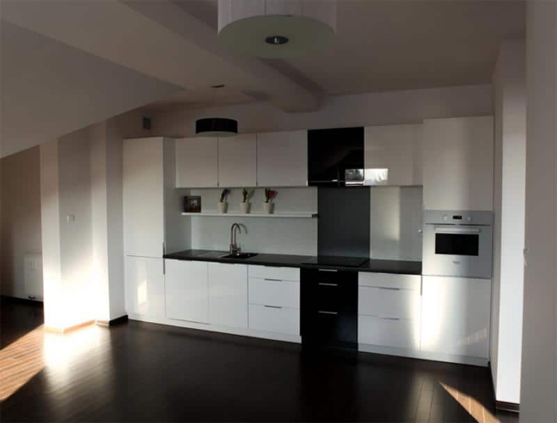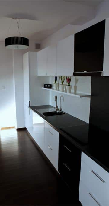 – Kuchnia: lodówka z zamrażarką, zlewozmywak, zmywarka, płyta elektryczna z pochłaniaczem, czajnik elektryczny, naczynia.