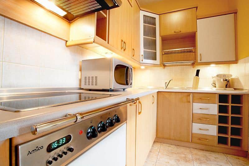 Skład apartamentu obejmuje jasny pokój, wygodną kuchnię oraz przedpokój z zabudową meblową o wysokim standardzie. Łazienka jest przestronna i wyposażona w dużą wygodną wannę oraz zasłonę natryskową.