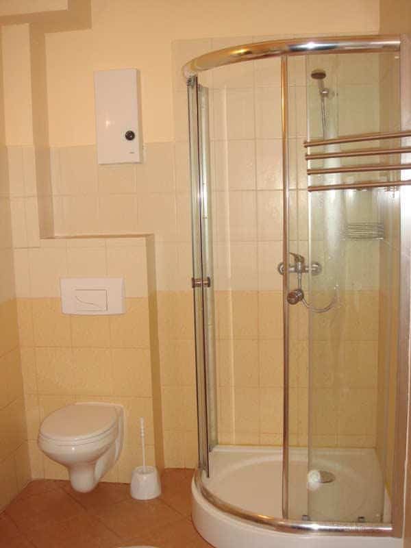 – **Łazienki**: Komfortowa i funkcjonalna, z kabiną prysznicową, podwieszaną ubikacją, pralką, umywalką, szafką i lustrem.