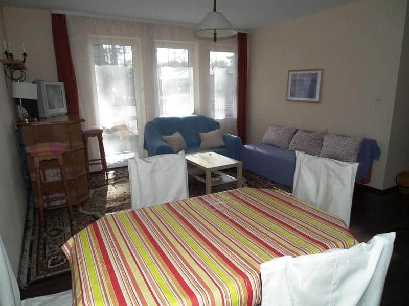– **Salonu**: Wyposażony w dwie rozkładane sofy, telewizor, radio, szafkę i ławę, stanowi doskonałe miejsce na relaks po dniu pełnym wrażeń.