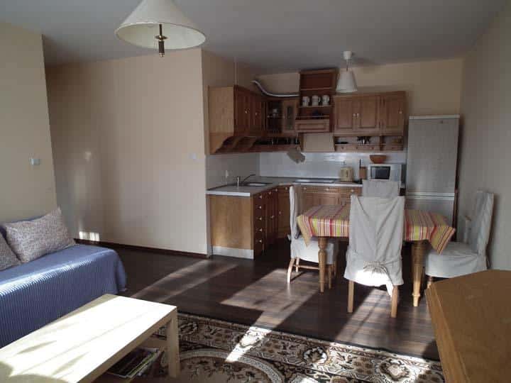 – **Kuchni**: Otwarta na salon, w pełni wyposażona w lodówkę, 4-palnikową ceramiczną płytę grzejną, zlewozmywak, czajnik bezprzewodowy, kuchenkę mikrofalową oraz naczynia. To idealne miejsce na przygotowanie pysznych posiłków.