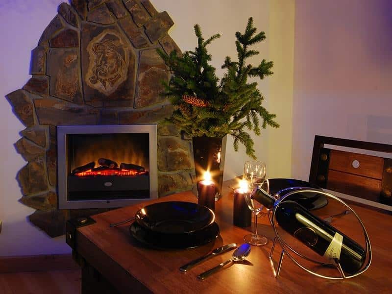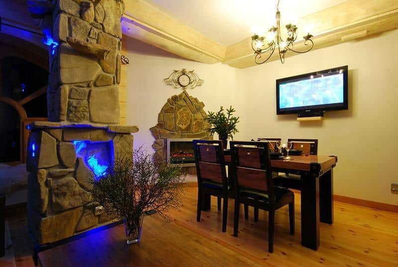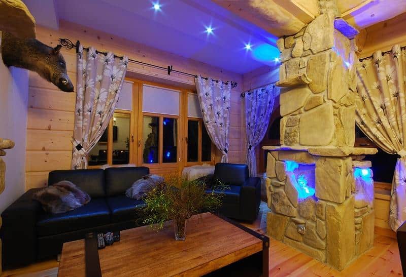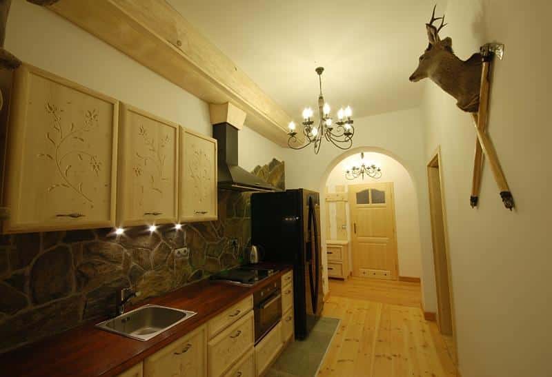 – Ściany ozdobione kamieniem naturalnym i porożem sarny.
