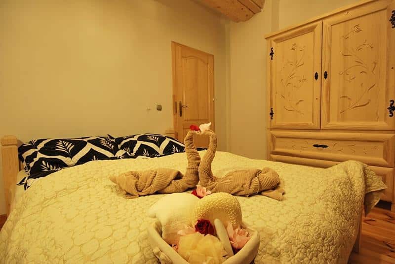 – Łóżka małżeńskie (160 cm) z ręcznie rzeźbionego drewna,