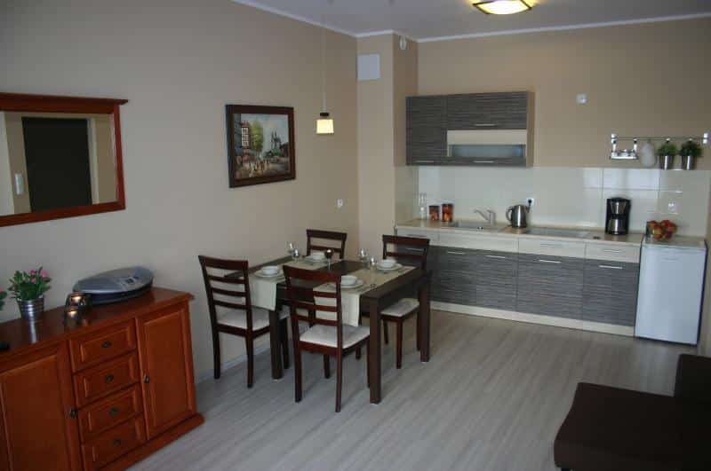 – **Aneks kuchenny**: lodówka, płyta ceramiczna, mikrofalówka, ekspres do kawy, czajnik