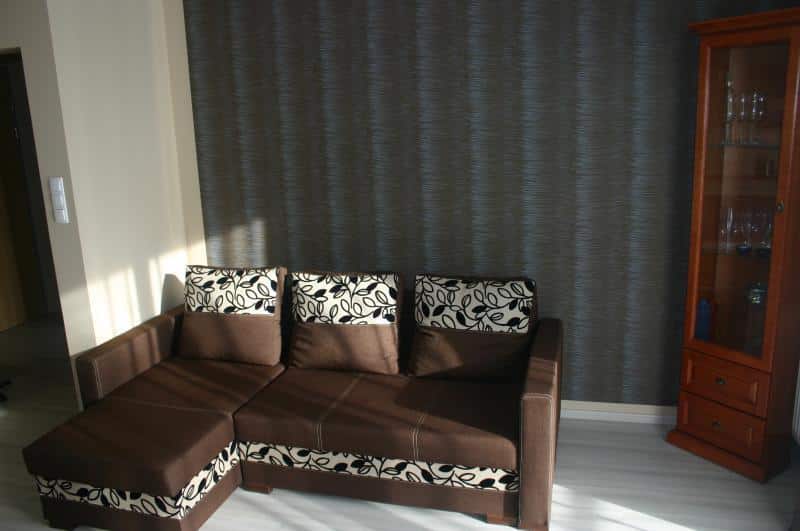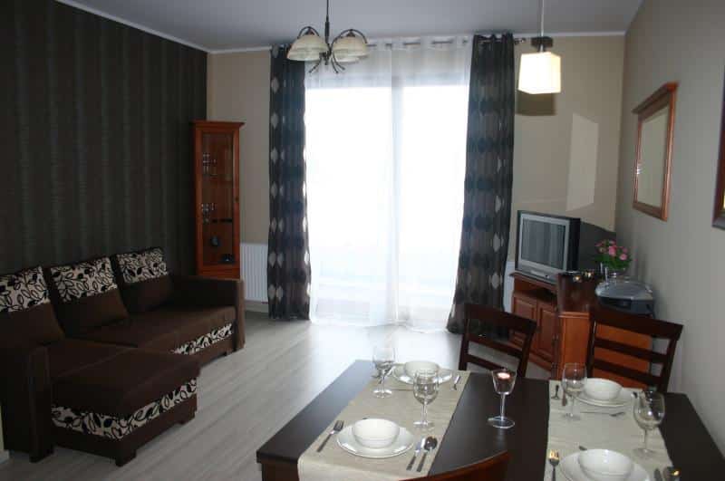 – **Salon**: rozkładana sofa, telewizor z kablówką, komoda, witryna, stół