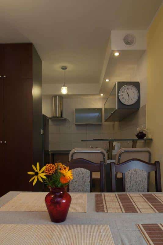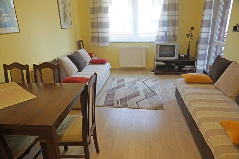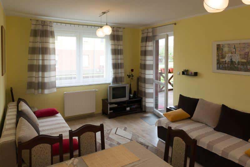 W pierwszym pokoju znajduje się aneks kuchenny oraz stół jadalny, a także dwie rozkładane sofy, które mogą służyć jako wygodne dwuosobowe łóżka. Drugi pokój to przytulna sypialnia z dużym, dwuosobowym łóżkiem.