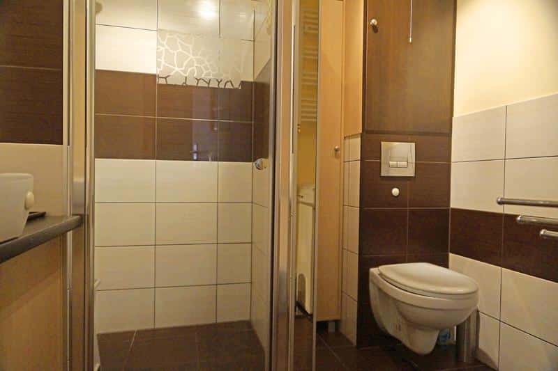 – Łazienka z dużą kabiną prysznicową i pralką,