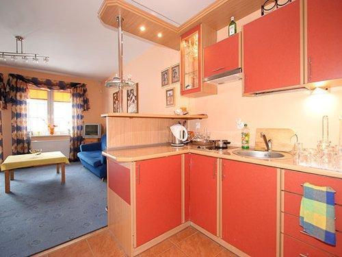 W pełni wyposażona kuchnia pozwala na samodzielne przygotowywanie posiłków. Znajdują się w niej: