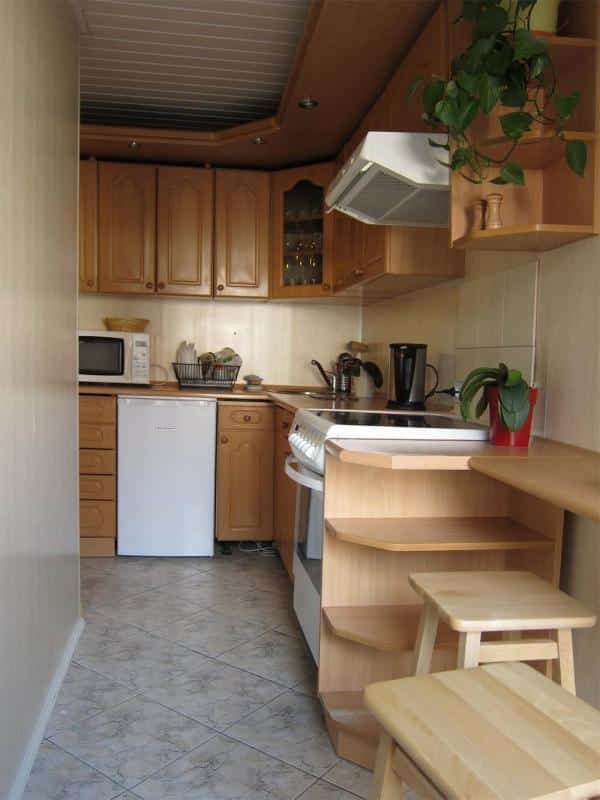 – kuchni (8 m²) wyposażonej w podstawowe sprzęty oraz barowy blat z taboretami,