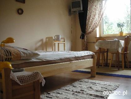 – Dwa osobne pokoje, każdy wyposażony w telewizor, radio oraz meble w stylu góralskim, takie jak krzesła, szafa, szafka, stolik RTV i stół.