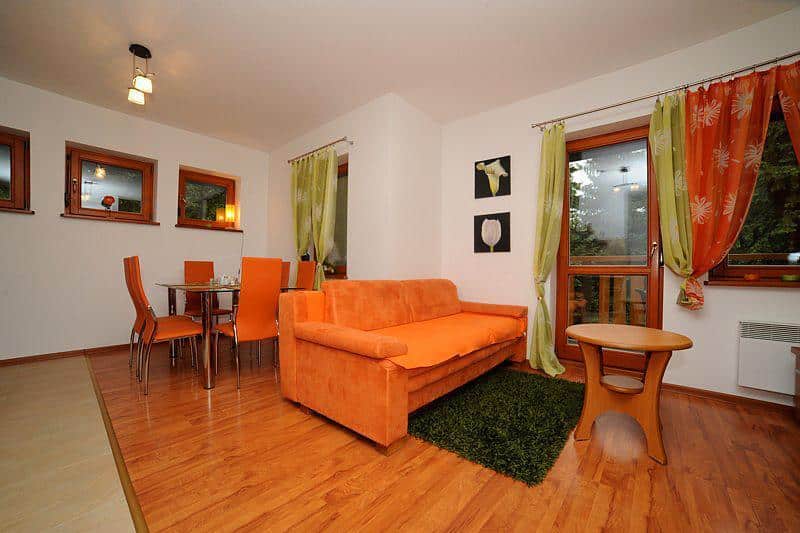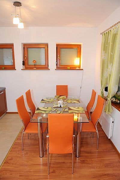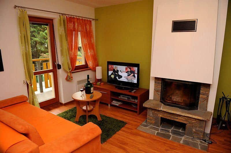 – **Salon z aneksem kuchennym**: wygodna dwuosobowa kanapa, telewizor LCD 37′, cyfra+, odtwarzacz DVD, stół dla 6 osób oraz kominek.