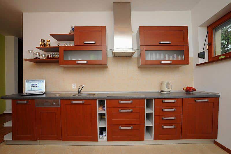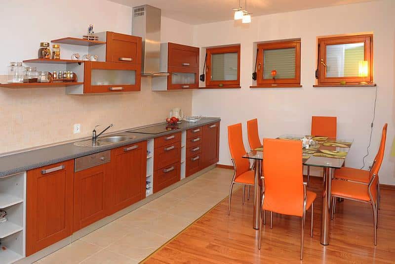 – **Aneks kuchenny**: lodówka, zmywarka, płyta grzewcza, okap elektryczny, czajnik, komplet naczyń, sztućców i przyborów kuchennych.