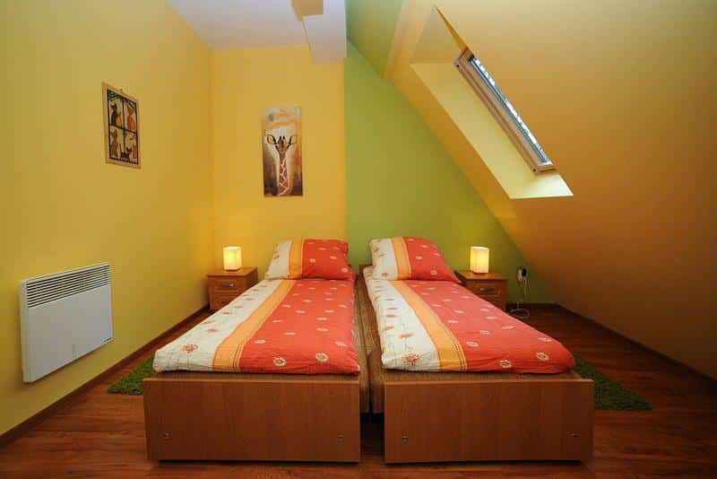 – Druga z dwoma pojedynczymi łóżkami (możliwość połączenia), szafkami nocnymi, komodą, telewizorem 21′ i cyfrą+.