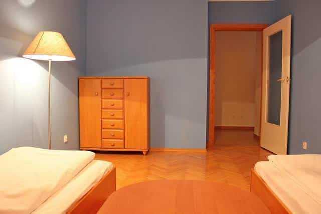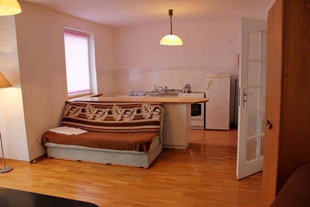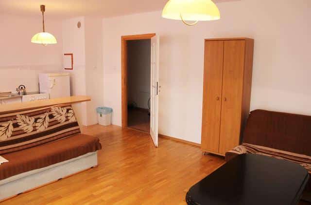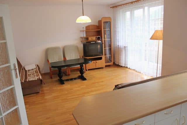 W apartamencie znajdują się dwa pokoje, z czego jeden połączony jest z praktycznym aneksem kuchennym. W pokoju dziennym do dyspozycji gości są dwie rozkładane wersalki, telewizor oraz pojemna szafa. Drugi pokój wyposażony jest w dwa pojedyncze łóżka, stół i komodę, co zapewnia komfortowy pobyt. Aneks kuchenny posiada lodówkę, kuchenkę oraz niezbędne naczynia, umożliwiając samodzielne przygotowanie posiłków. Łazienka oferuje wannę oraz pralkę, a w cenie pobytu zapewniamy świeżą pościel.