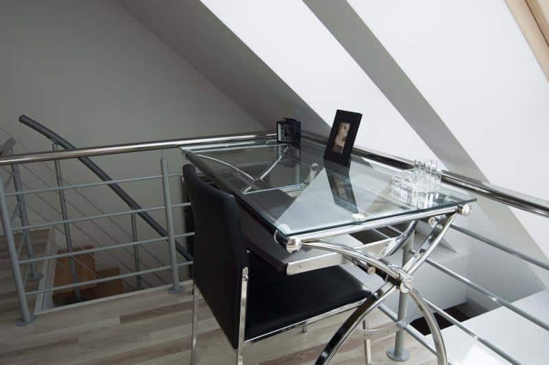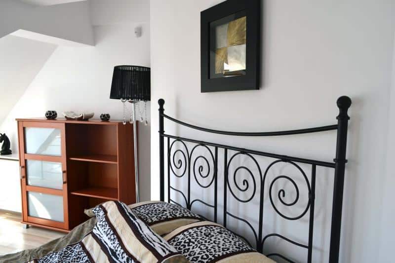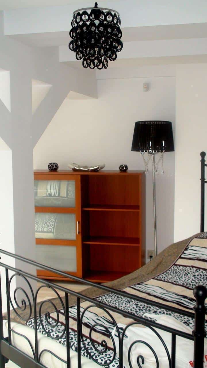 – Sypialnia: łóżko małżeńskie (140 x 200 cm), stolik nocny, szafa na ubrania, komoda, lampa stojąca, lustro, szklane biurko z krzesłem, deska do prasowania, żelazko