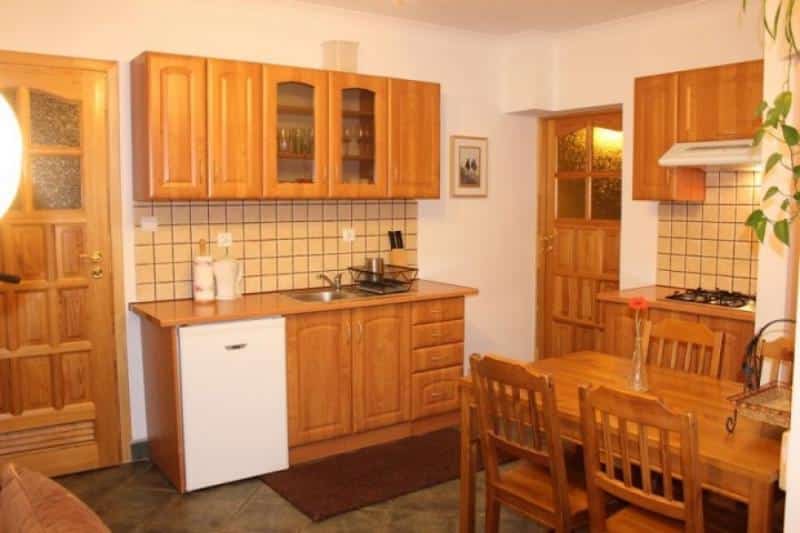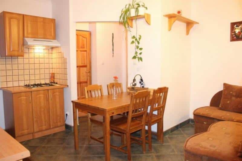 – Salon z aneksem kuchennym: W pełni wyposażony w płytę gazową, lodówkę, czajnik, naczynia, sztućce i żelazko. W salonie znajduje się narożnik dla dwóch osób.