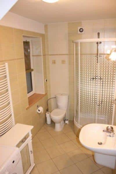 – Łazienka: Wyposażona w kabinę prysznicową, toaletę, umywalkę oraz pralkę.
