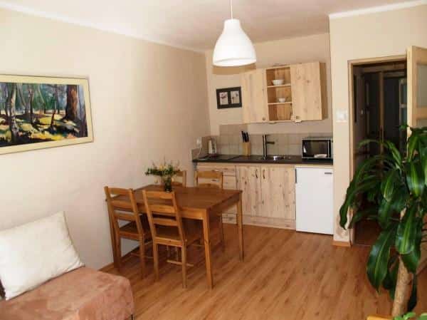 – Aneks kuchenny w pełni wyposażony w płytę elektryczną, mikrofalówkę, lodówkę, czajnik oraz wszelkie niezbędne naczynia, talerze, sztućce i filiżanki,