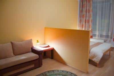 – Pokój z niską ścianką oddzielającą łóżko 2-osobowe od rozkładanej kanapy