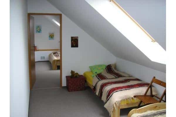 Nasz pensjonat to doskonała baza wypadowa dla miłośników przygód i zwiedzania. Położony tuż przy lesie i blisko jeziora, oferuje komfortowe warunki pobytu. Do Państwa dyspozycji oddajemy dwa nowoczesne, klimatyzowane apartamenty, mieszczące się na całym poddaszu domu, z osobnym wejściem. Każdy z apartamentów pomieści do 6 osób i wyposażony jest w łazienkę, telewizor z DVD oraz komputer z dostępem do internetu. Dla obu apartamentów dostępna jest duża, w pełni wyposażona kuchnia z lodówką.