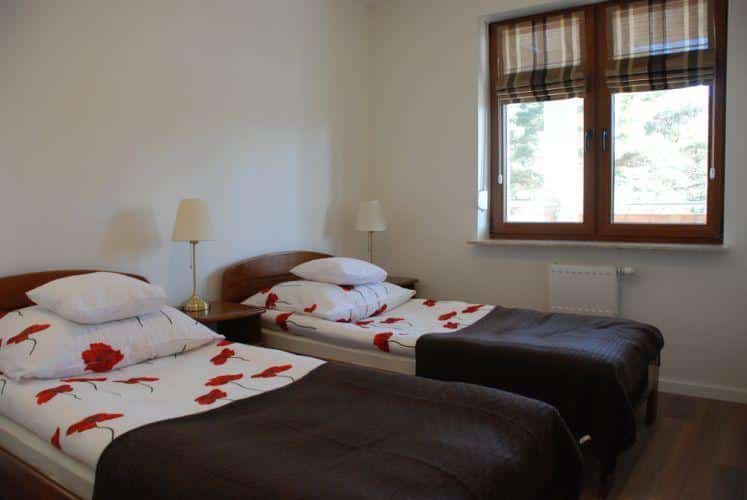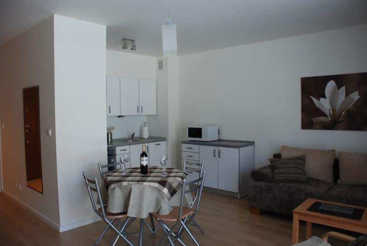 Pierwszy pokój to przytulna sypialnia dla dwóch osób, z możliwością dostawienia łóżeczka dziecięcego. Drugi pokój to przestronny salon, w którym znajduje się dwuosobowa kanapa oraz w pełni wyposażony aneks kuchenny. Znajdziesz tu wszystko, czego potrzebujesz do przygotowania posiłków: dużą lodówkę, kuchnię elektryczną, zmywarkę, mikrofalówkę oraz wszelkie niezbędne przybory kuchenne.