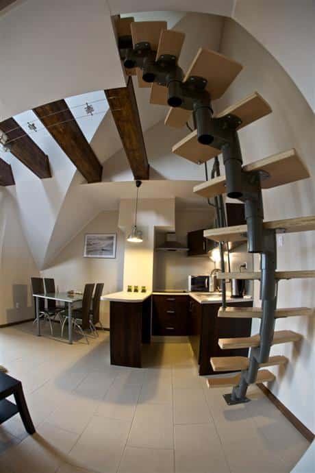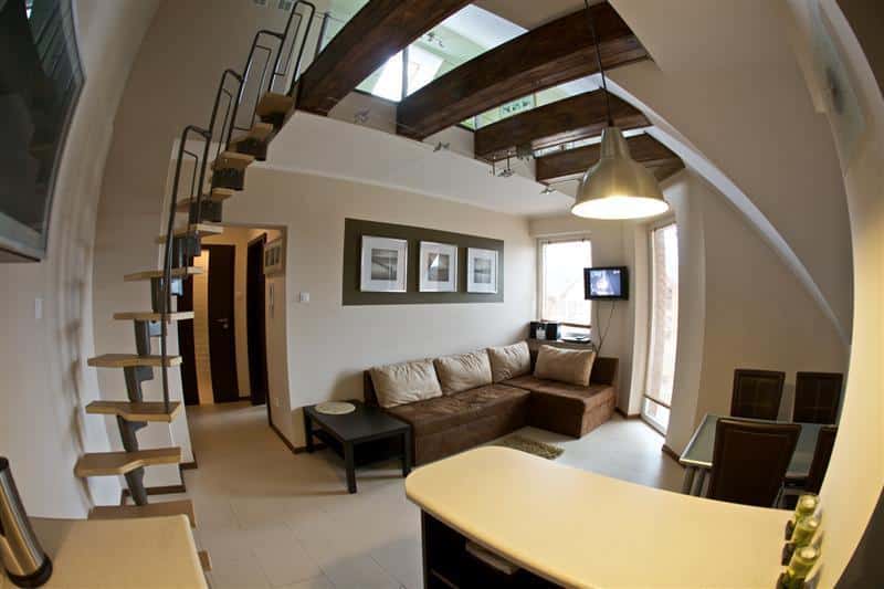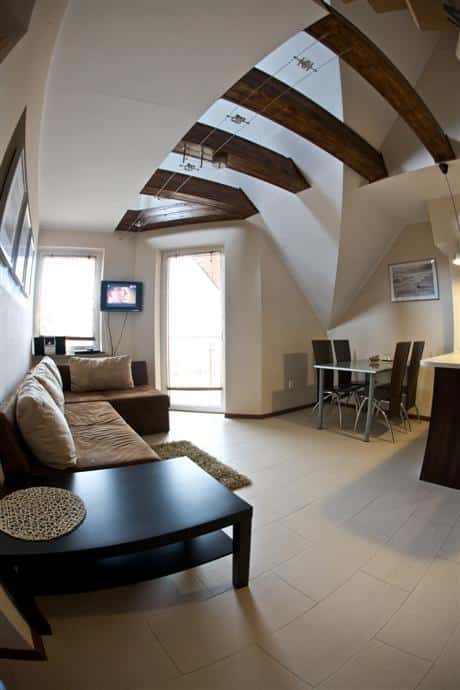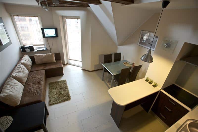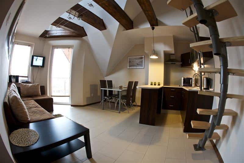 – Przestronny salon z w pełni wyposażonym aneksem kuchennym,