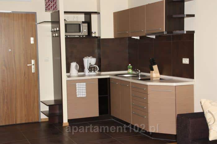 – Aneks kuchenny z pełnym wyposażeniem: płyta ceramiczna, zmywarka, lodówka, ekspres do kawy,