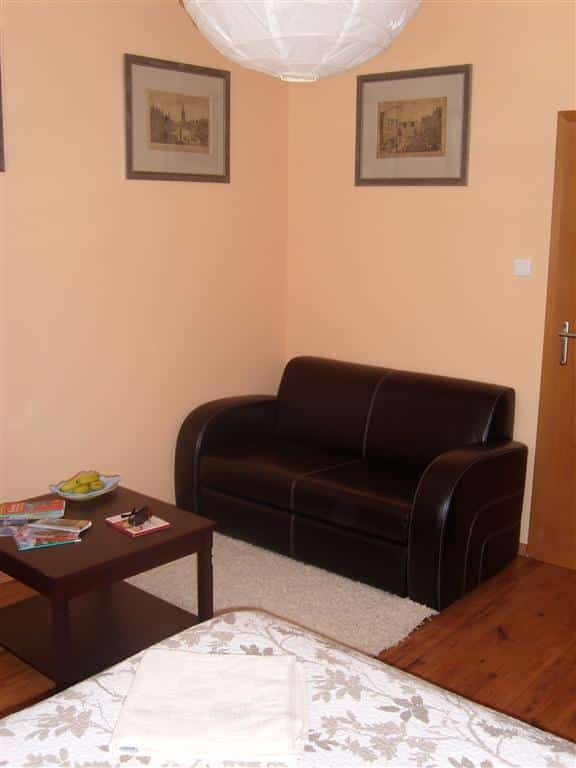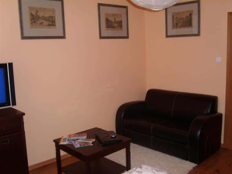 – Pokój z łóżkiem małżeńskim (160×200 cm) oraz sofą z funkcją spania (120×200 cm),