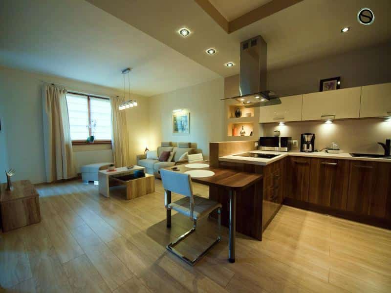 Każdy apartament składa się z przestronnego salonu z aneksem kuchennym, jadalni oraz sypialni z łóżkiem małżeńskim lub dwoma pojedynczymi łóżkami. Dodatkowo, do dyspozycji gości jest garderoba. W salonie znajdziecie wygodną sofę, fotele, stolik, telewizor LCD z TV-sat oraz dostęp do internetu. Kuchnia jest w pełni wyposażona, m.in. w płytę ceramiczną, piekarnik, zmywarkę i mikrofalówkę.