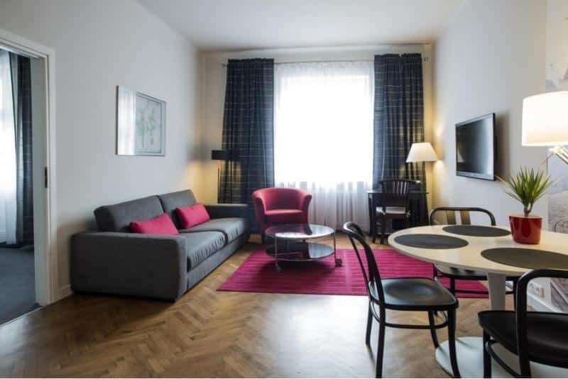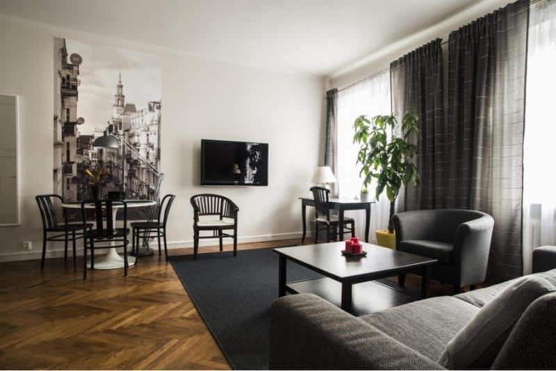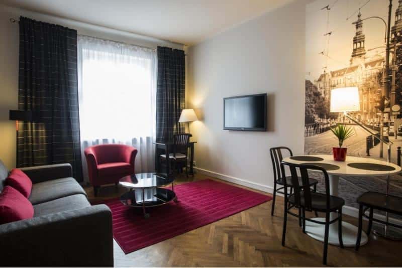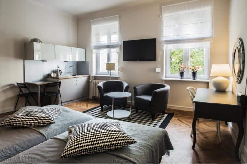 Dodatkowo, każdy apartament oferuje aneks kuchenny z naczyniami, czajnikiem elektrycznym, lodówką, kuchenką mikrofalową i ekspresem do kawy. Wszystkie apartamenty wyposażone są również w ceramiczny piec. Lokalizacja kompleksu jest bardzo dogodna – odległość od dworca kolejowego i autobusowego Poznań Główny wynosi jedynie 550 metrów. Główna ulica Poznania, Święty Marcin, znajduje się w odległości 17 minut spacerem od apartamentów, natomiast park Wilsona oddalony jest o zaledwie 50 metrów.